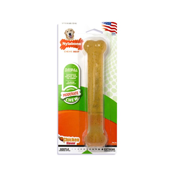 Moderate Chew FlexiChew toys are made with softer material so gentle chewers can enjoy a bone of their own. This chew toy keeps dogs entertained with delicious chicken flavor throughout, and the bristles raised during chewing help clean teeth and control plaque and tartar buildup. (Not recommended for strong chewers.) Go ahead and give your dog a Nylabone! Nylabone helps you establish a positive dental health routine for your dog, with edible dental chews, a full range of oral care supplies, and chew toys that leave your dog with cleaner teeth. Whether you’re hunkering down to brush your dog’s teeth, setting him up for a chewing session, or giving him a mouth-friendly snack, Nylabone chew toys and edible chews help keep your dog’s smile healthy and his breath fresh.