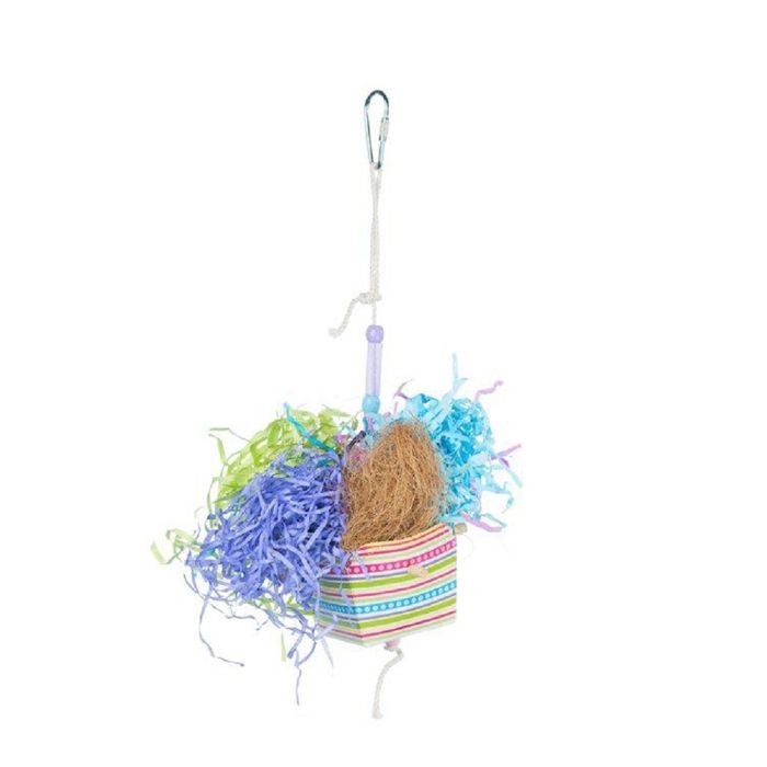 Prevue Pet Products Baskets Banquet 62673 is a multicolored pull toy designed for satisfying preening instincts, discouraging plucking in your bird, and satisfying nesting instincts. Basket of Bounty is made from an assortment of cotton twine, coconut fibers, and multi-colored paper providing your bird with mental stimulation and hours of fun. The plastic beads provide a rugged texture for beak and tongue exercise. The imaginative paper cup provides a place for your bird to satisfy their nest-building urges. All materials are 100% pet safe with non-toxic, food-grade colors and connect easily to cage with stainless steel quick-link attachments- actual measurements may vary slightly. As always, supervise birds at play. Our Baskets of Bounty toy measures 4" in diameter and 7" high.