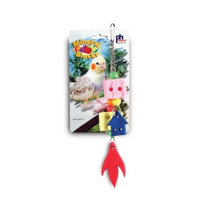 Prevue Pet Products Mineral Blocks with Toys contain natural ground seashell and limestone grit for an excellent source of calcium. Treats are fruit-scented and also contain iodized salt, a required nutrient for avian health. Toy measures 3" Wide and 10" Long.
