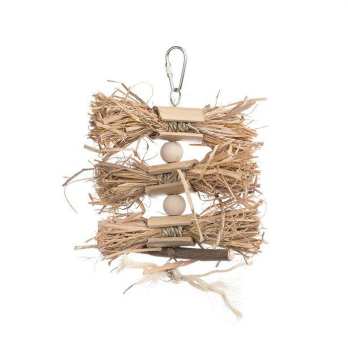 Prevue Pet Products Woodland Harvest Bird Toy 62549 satisfies natural nest-building urges while providing great beak exercise. Toy is made from natural products including bamboo,straw, and seagrass to satisfy plucking, preening, nesting, and foraging instincts. Woodland Harvest Bird Toy includes additional materials, such as rope and hardwood shapes encouraging beak and tongue exercise. Toy connects easily to cage with stainless steel quick-link attachments– actual measurements may vary slightly. As always, supervise birds at play. Our Woodland Harvest Bird Toy 62549 bird toy measures 6" long, 1 1/2" wide, and 8" high. Ideal for x-small, small, and medium birds measuring 4" to 18" beak to tail.