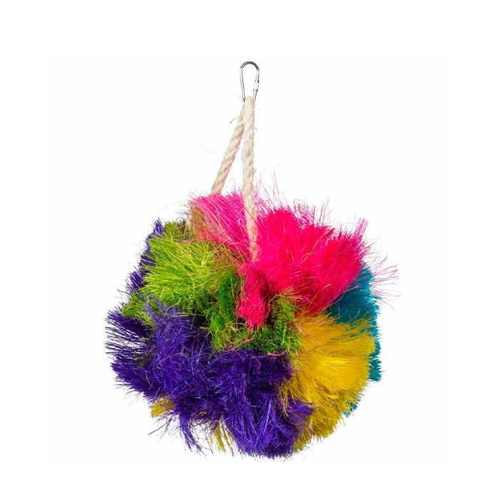 This toy is ideal for medium to large birds. Tropical Teasers feature 100% natural dehydrated and sterilized coconut fiber, colorful hardwood shapes, plastic beads, coconut shell fragments and bells. Each toy is comprised of 100% safe, non-toxic materials and have quick-link attachments. This line is geared towards nest building and beak exercise.