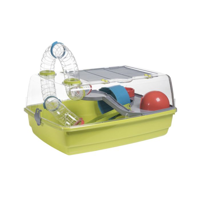 This cage closed with transparent hard plastic allows a perfect view of your pet. It has a narrow passage ventilation grille on the top, ideal for any type of hamster. It has 2 levels, includes a ladder, ferris wheel, feeder and iglu house and tube circuit for our pet's fun. Made in Spain with wire covered in lead-free epoxy paint and recycled polypropylene plastic, non-toxic raw materials for your pet. We have spare parts and accessories to complete the cage. To improve the health and comfort of the pet, VOLTREGA recommends cleaning the cage with specialized products once a week, preferably with Zerobakter. Voltrega also offers you many accessories for your cage as well as toys and snacks for your pet.