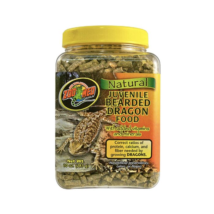 Your Bearded Dragon’s health will greatly benefit from Zoo Med’s Bearded Dragon Foods. Each formula has been created with your Bearded Dragon’s nutritional requirements in mind. The correct ratios of protein, calcium, and fiber make up these foods; the Juvenile formula was specially formulated for growing dragons and the Adult formula for the long-term health of adult Dragons. Bearded Dragons will enjoy the flavorful Dandelion Greens and other nutritional plants that make up this new food, especially when mixed with Zoo Med’s Can O’ Mini Crickets and Can O’ Mini Mealies.